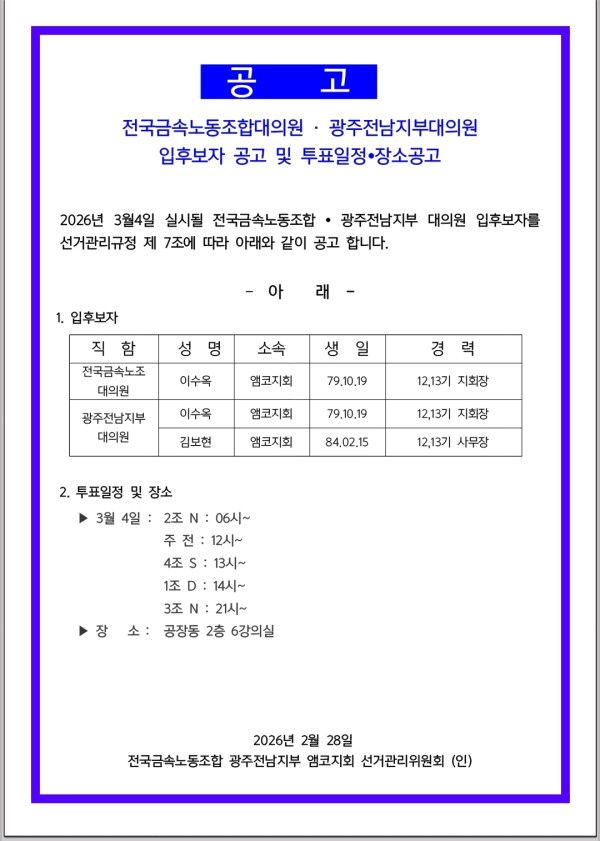 금속노조, 광주전남지부 대의원 입후보공고 및 투표일정